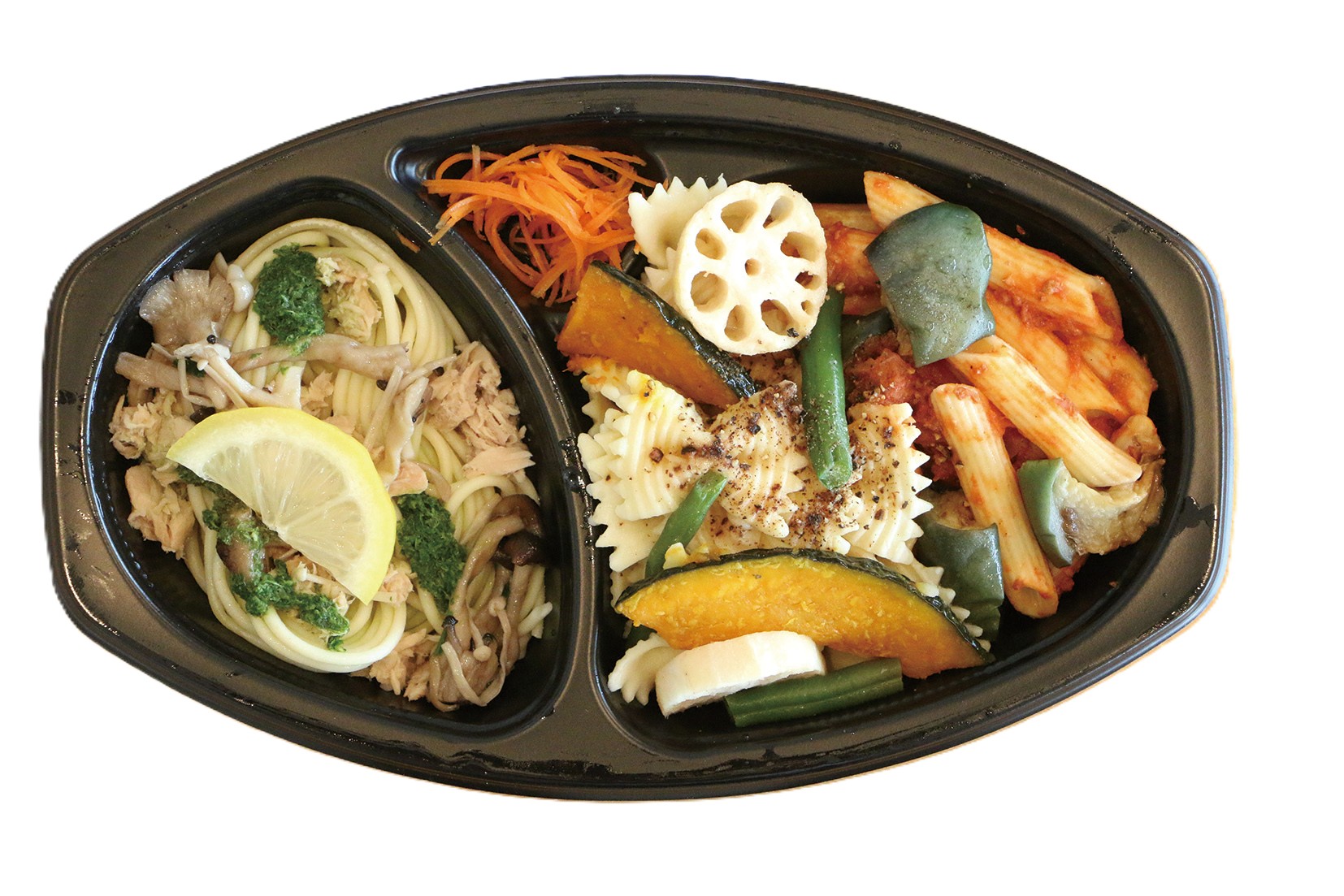 『様々な種類があるパスタを楽しみながら味わっていただきたいという思いから、主食、主菜、副菜、それぞれに用いて、秋野菜をうまく組み合わせた献立にしています。和、洋、中が味わえるバラエティに富んだ弁当となっています。』