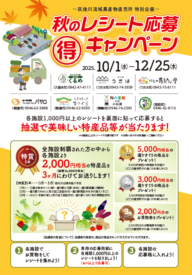 内容:応募期間中に筑後川流域の農産物直売所7施設のうち、「4施設のお買い上げ1,000円以上のレシート」を集めて、各地域の特産品が当たる抽選に応募しましょう!