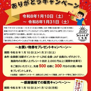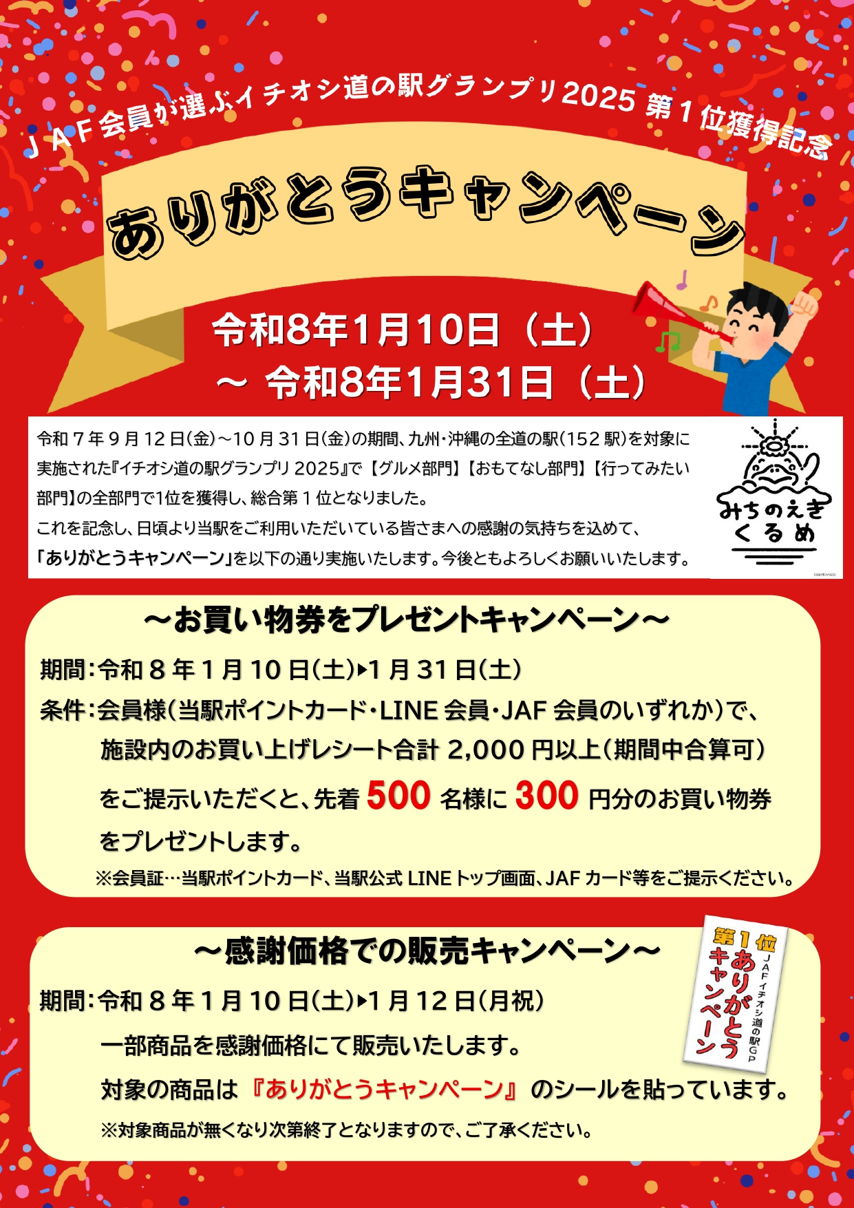 内容:令和7年9月12日~10月31日に実施された『JAF会員が選ぶイチオシ道の駅グランプリ2025』において、九州・沖縄152駅の中から、【グルメ】【おもてなし】【行ってみたい】の全部門で1位を獲得し、総合第1位となりました。これを記念し、日頃の感謝を込めて「ありがとうキャンペーン」を実施いたします。今後ともよろしくお願いいたします。