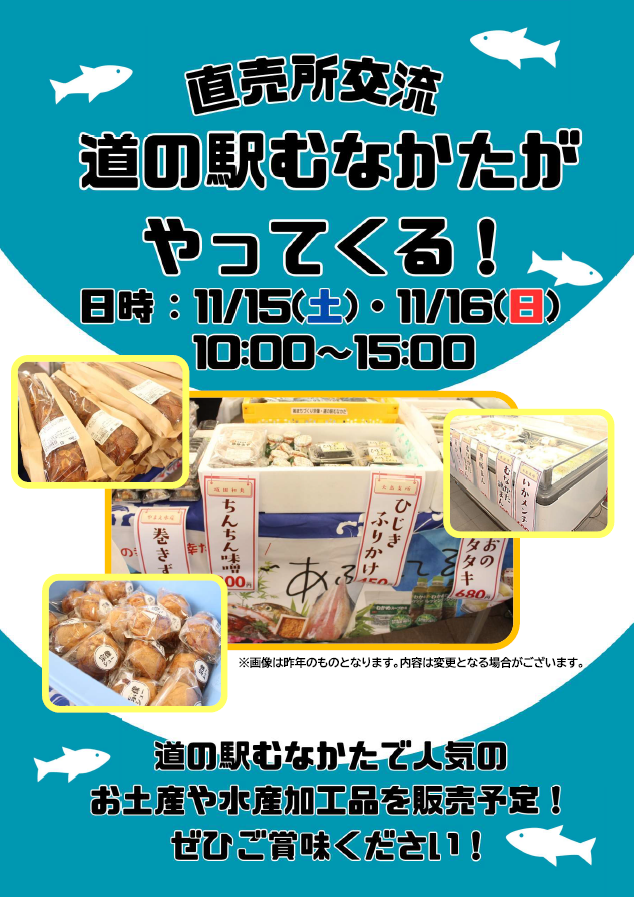 11月15日(土)・16日(日)の2日間、当駅イベント広場にて、大人気の道の駅『道の駅むなかた』が海産物加工品や名産品の対面販売を行います!