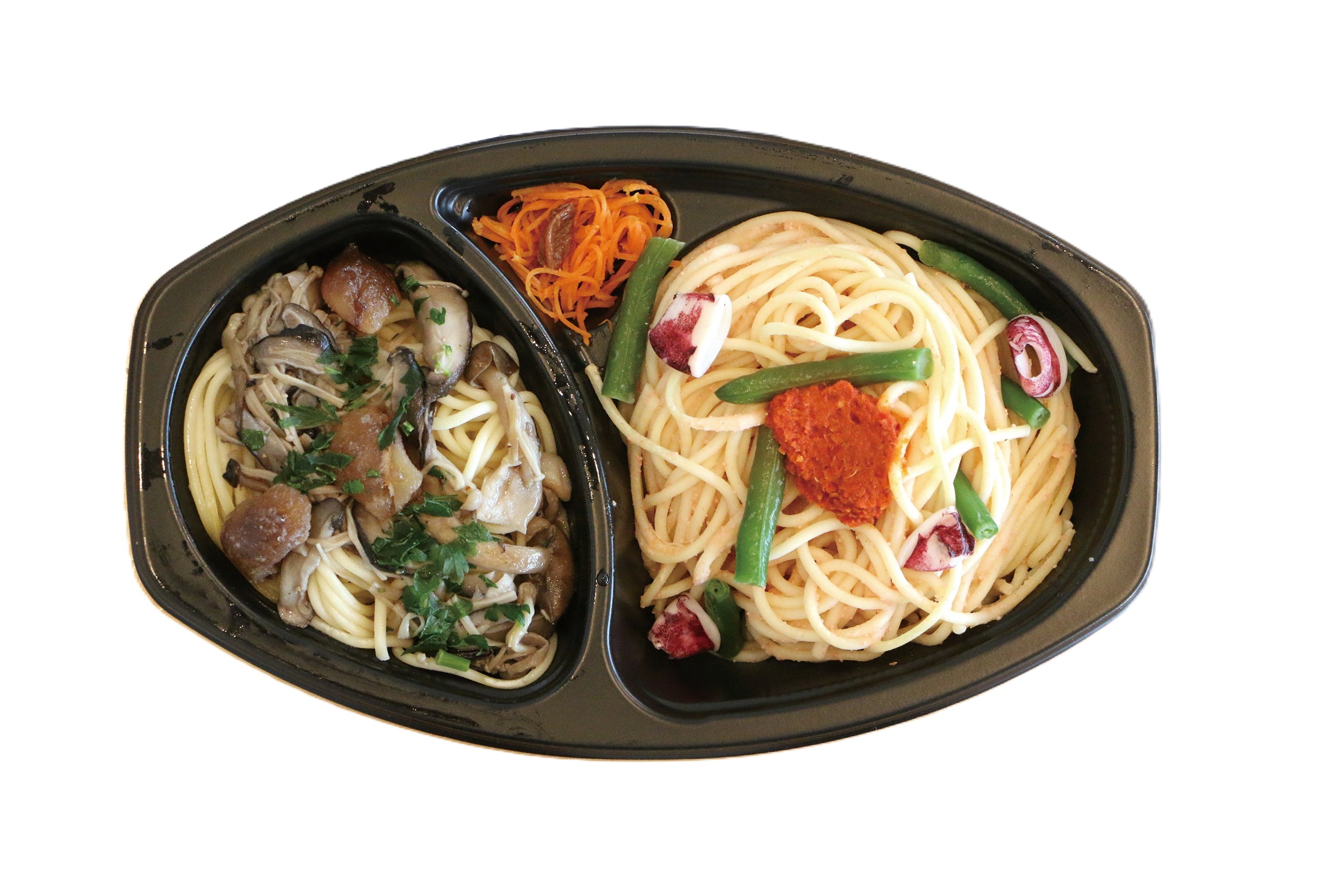 『2種類のパスタを作り、1種類ずつ食べても、2種類を混ぜ合わせて食べてもおいしく食べられます。2種類とも和風の味に仕上げ、秋の旅行シーズンに食べたくなるお弁当です。栗の甘露煮の甘さとパスタの塩味があわさってとてもおいしくなりました。』
