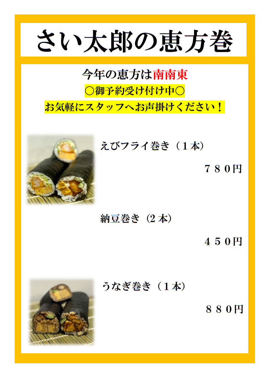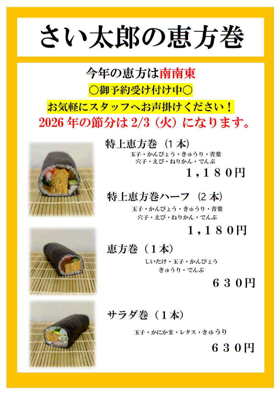◆人気のお寿司屋さん、さい太郎が作る恵方巻のご予約受け付け開始いたしました!